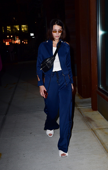 На наступному фото Белла Хадід. Красуня обрала для вечірнього походу костюм у розслабленому стилі разом із трендовими хутряними шльопанцями.