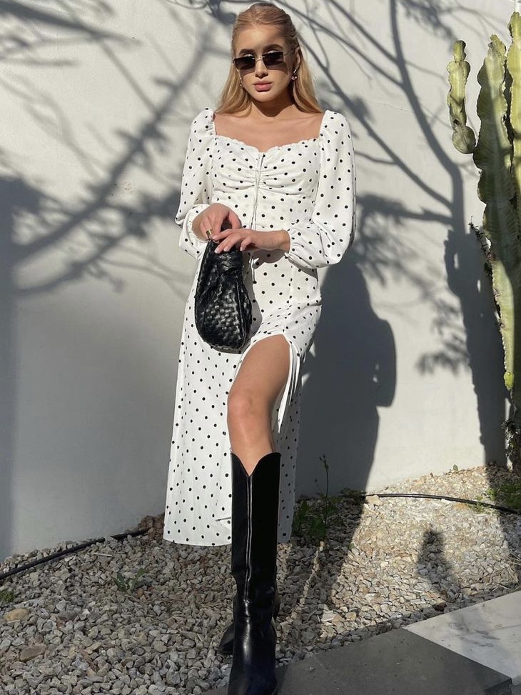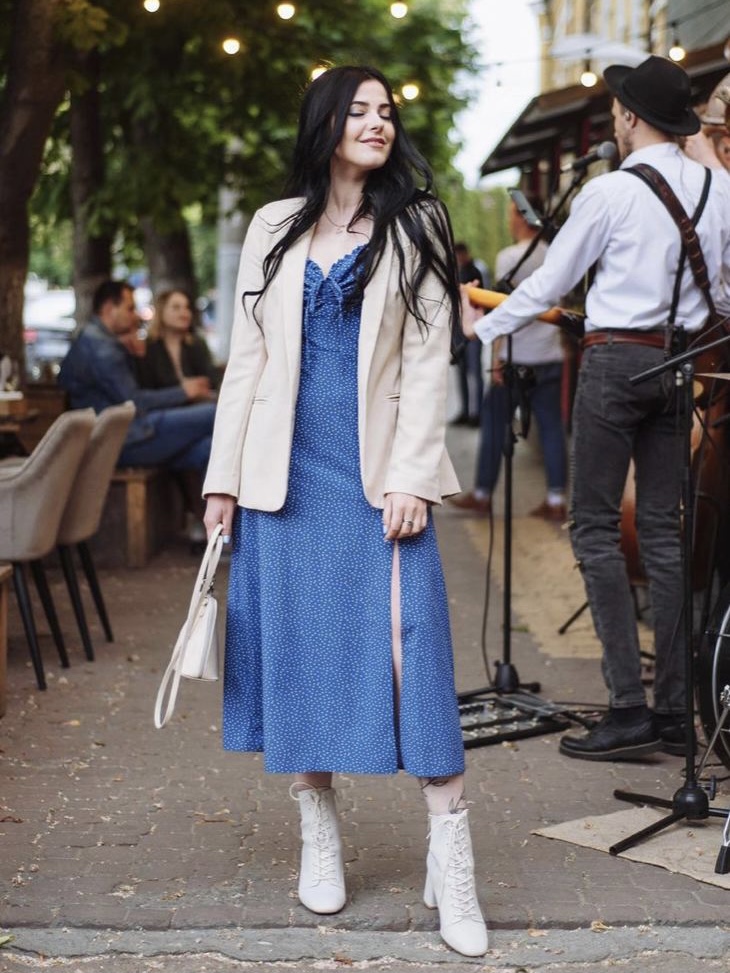 Синій колір сукні вибрала для себе Діана Решетова (@diana_reshetova), дівчина поєднує сукню з жакетом і черевиками світлого кольору, додаючи контрасту у свій незабутній образ.