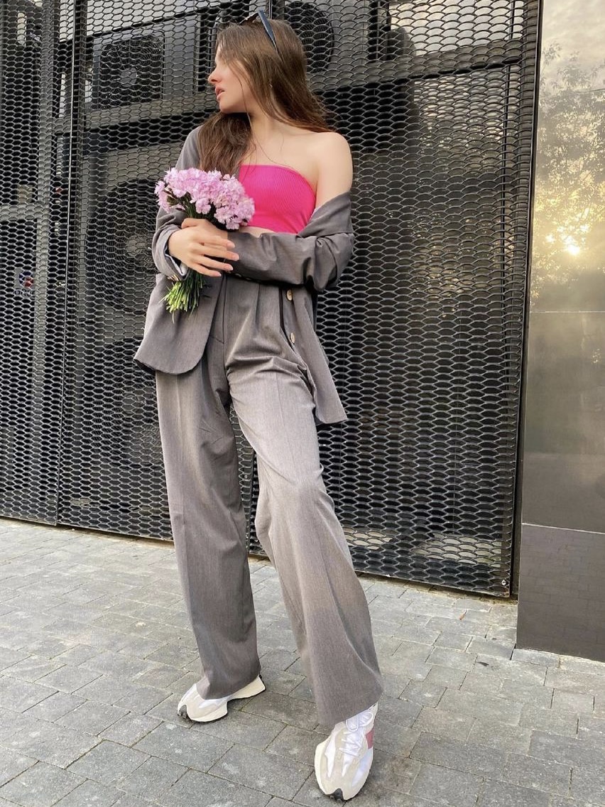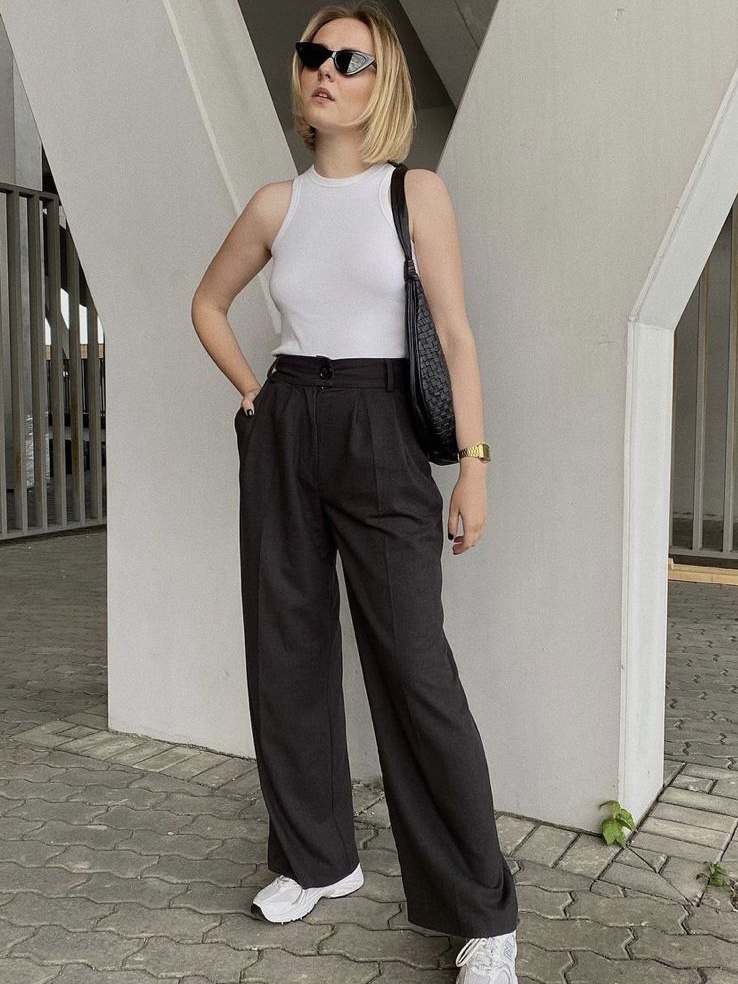 Перед вами два фото стильних образів цього сезону. На першому фото Ольга (@olha.hutseliuk), дівчина поєднує образ з топом неонового кольору та кросівками. На другому фото Ірина (@irka_kvitka), поєднує білу майку-алкоголічку, штани палаццо та чорну сумочку. Простота образів робить його незабутнім, ось що означає фраза «просто і зі смаком».