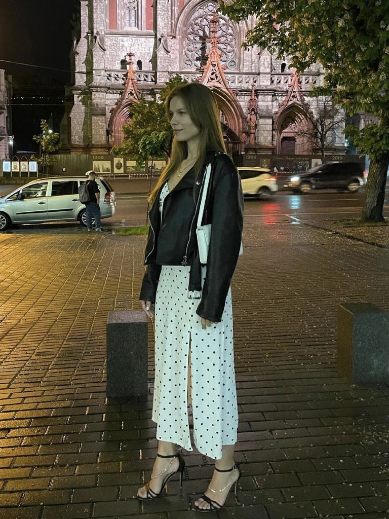 Праворуч - Валерія (lerok_._), дівчина скомбінувала шкіряну косуху чорного кольору з чорними босоніжками та білою сумочкою у колір сукні, що робить образ романтичним та зухвалим одночасно.
