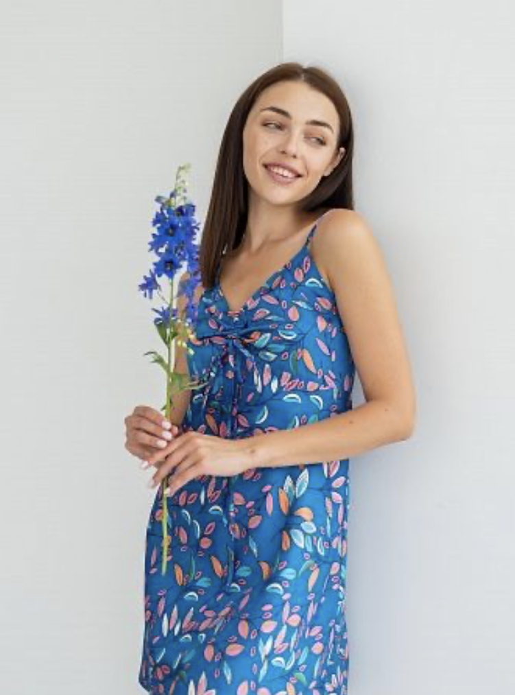 На фото сукня міні з розпіркою у різних варіаціях принту та сарафан з атласу від MBocharova.