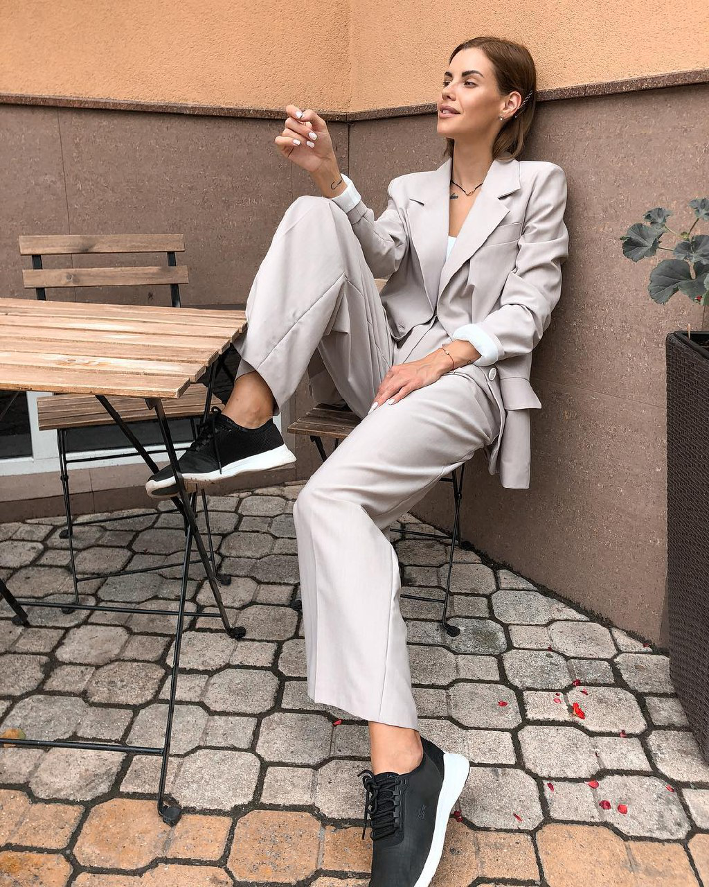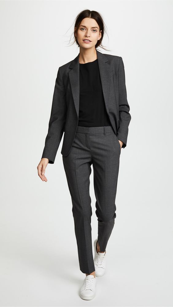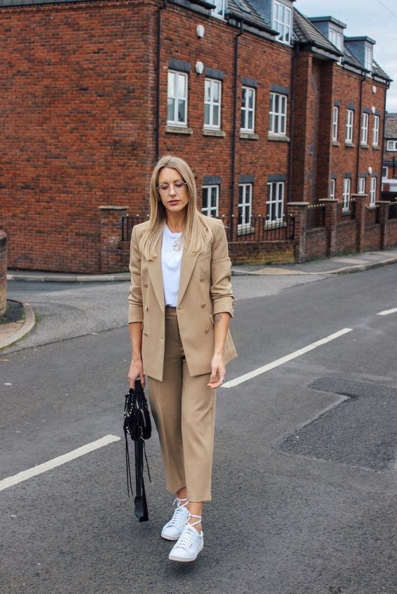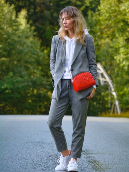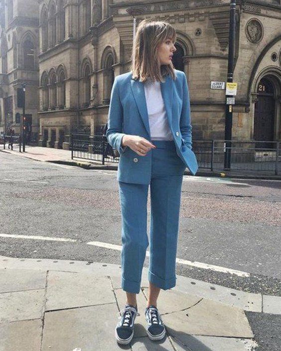 Якщо твоє улюблене взуття – кеди, то тобі також можна сміливо носити костюми. Будь-який костюм простого крою відмінно розбавлять кросівки чи кеди. Це не лише зручно, а й стильно. Погодься, приємніше працювати в комфорті, тоді і настрій буде кращим. Тому, можна пустувати і скомбінувати штани, піджак і кросівки