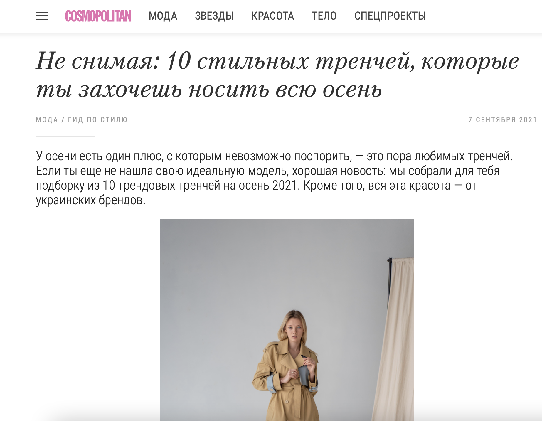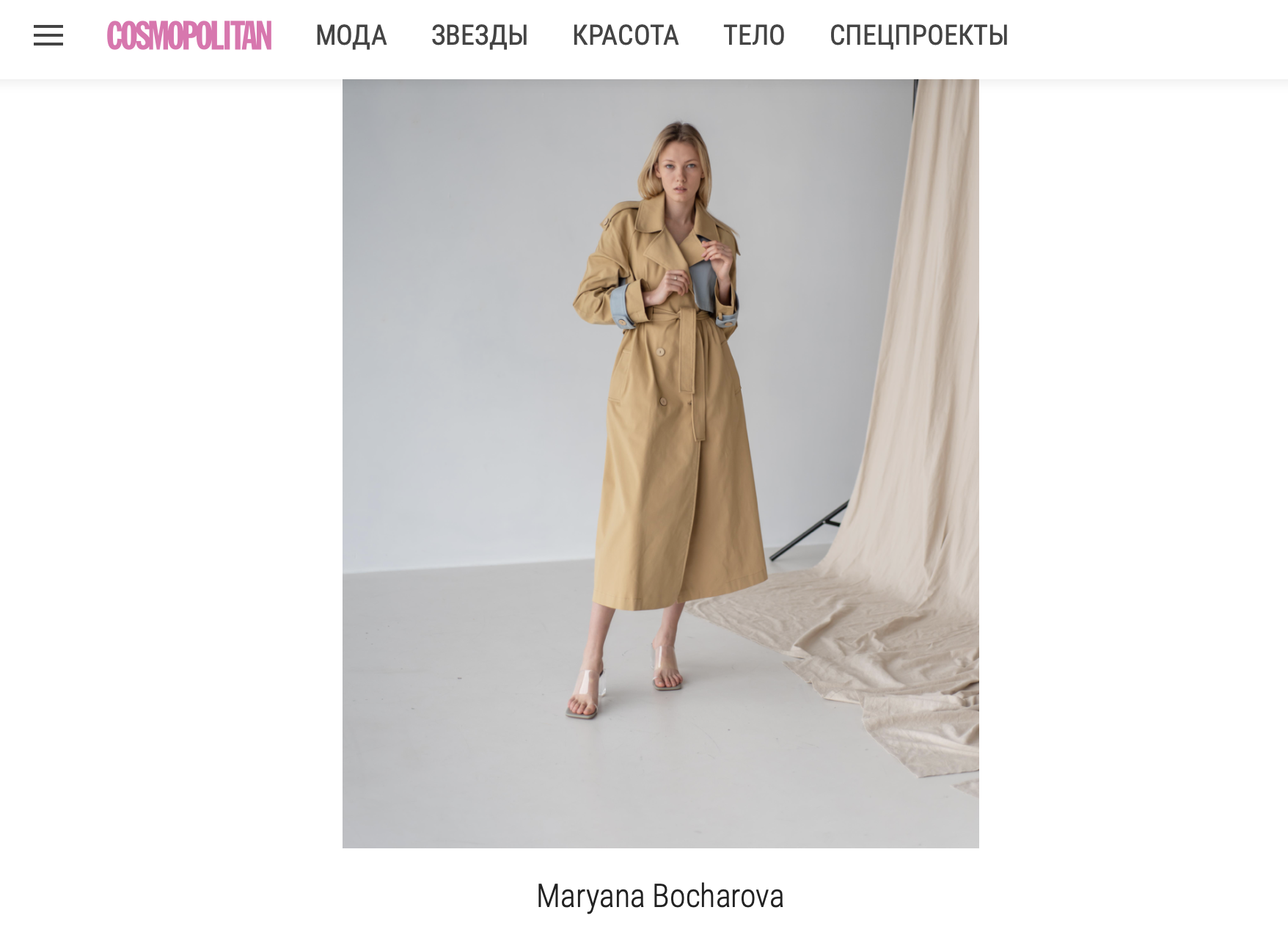Бренд MBocharova вже не вперше потрапляє у добірку від відомого журналу Cosmopolitan Україна. На цей раз під назвою "Не знімаючи: 10 стильних тренчів, які ти захочеш носити всю осінь" (фото нижче).