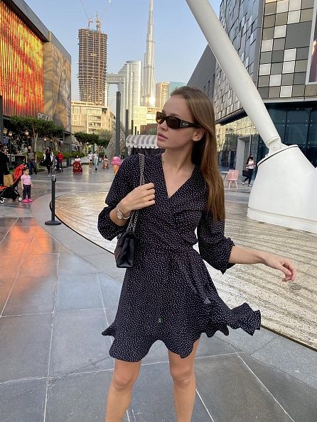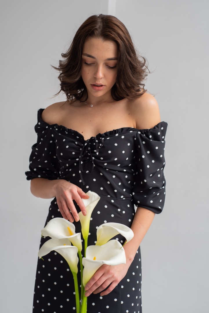 Ще один безпрограшний варіант цікавого крою з невеликим вирізом на нозі. Зробіть легкі локони, нюдовий макіяж та автоматично станете окрасою вечора. Сукня міді в горошок від MBOCHAROVA додасть витонченості будь-якому образу.