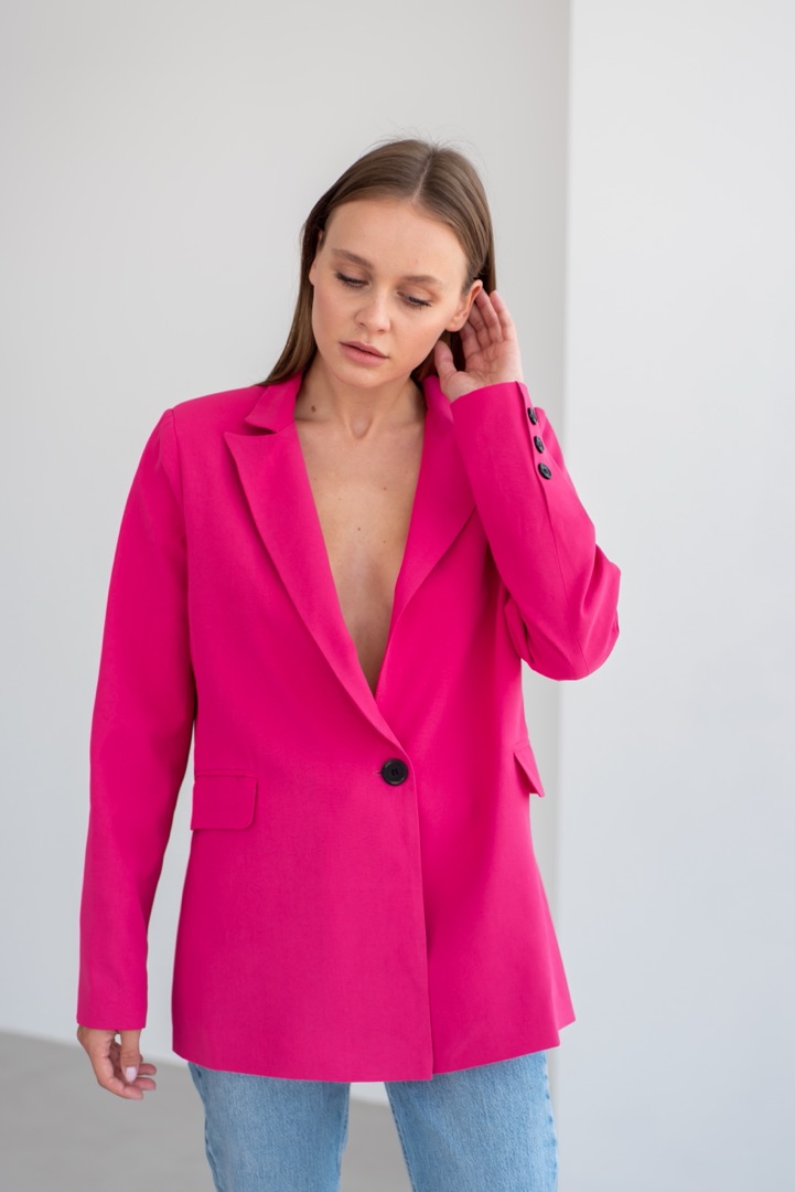 А якщо ви любителька ефектнішого вбрання. Оверсайз жакет у трендовому кольорі фуксія – це те, що вам треба! Він допоможе розбавити будь-яке вбрання. Шорти, спідниця, джинси або сукня, додавши жакет малинового кольору від MBOCHAROVA, будь-який образ привертатиме увагу оточуючих.